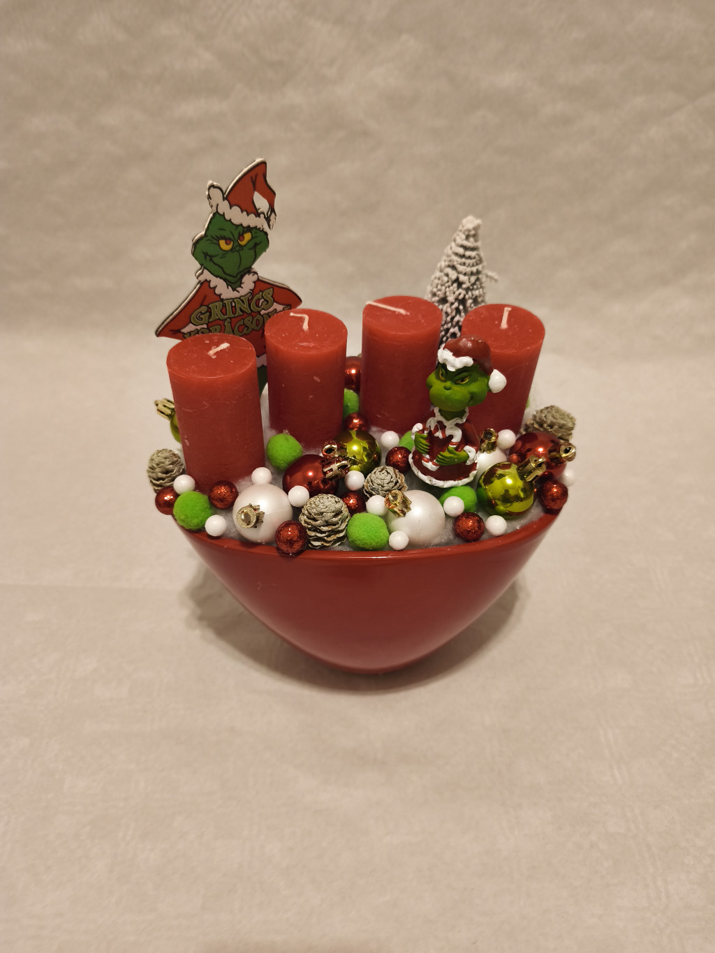 Karácsonyi Grincs adventi dekoráció piros tálban, négy gyertyával és csillogó ünnepi díszekkel. Egyedi kézműves adventi dísz, tökéletes ajándék és hangulatteremtő dekoráció a karácsonyi szezonban.