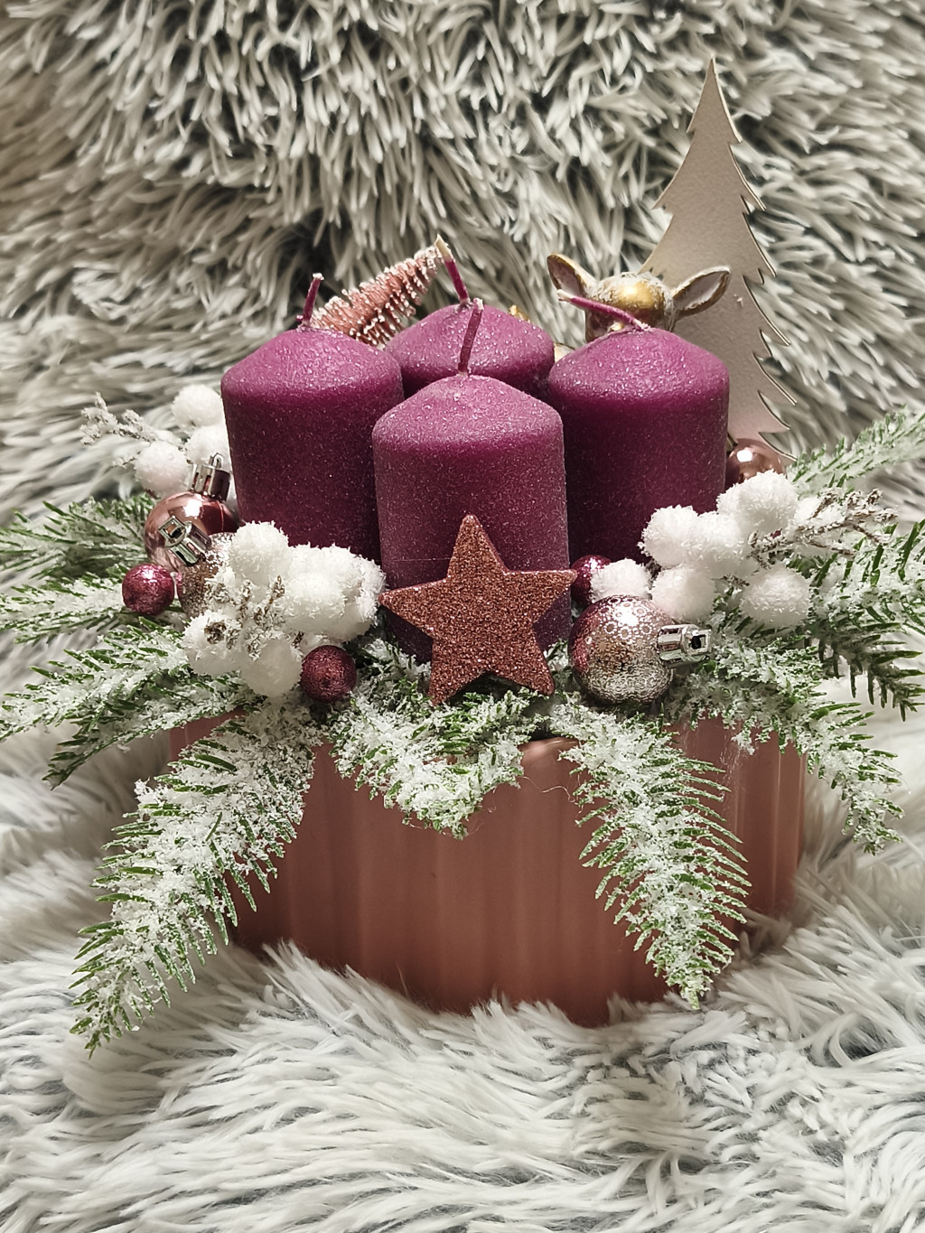 Varázsold ünnepivé az adventi időszakot ezzel a gyönyörű, kézzel készült sötétebb árnyalatú rózsaszín-fehér adventi díszkompozícióval!