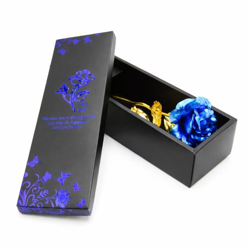Elegáns kék fémrózsa díszdobozban 27,5×9×7 cm méretben, különleges és időtálló ajándék romantikus és ünnepi alkalmakra. Prémium minőségű, stílusos dekoráció szeretteidnek.