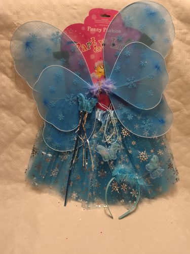Mesés kék csillámporos Lepketündér jelmez szett, amely tartalmaz tüllszoknyát, csillogó szárnyakat, varázspálcát és fejpántot. Tökéletes választás farsangra, jelmezbálra és tündéres szerepjátékhoz.