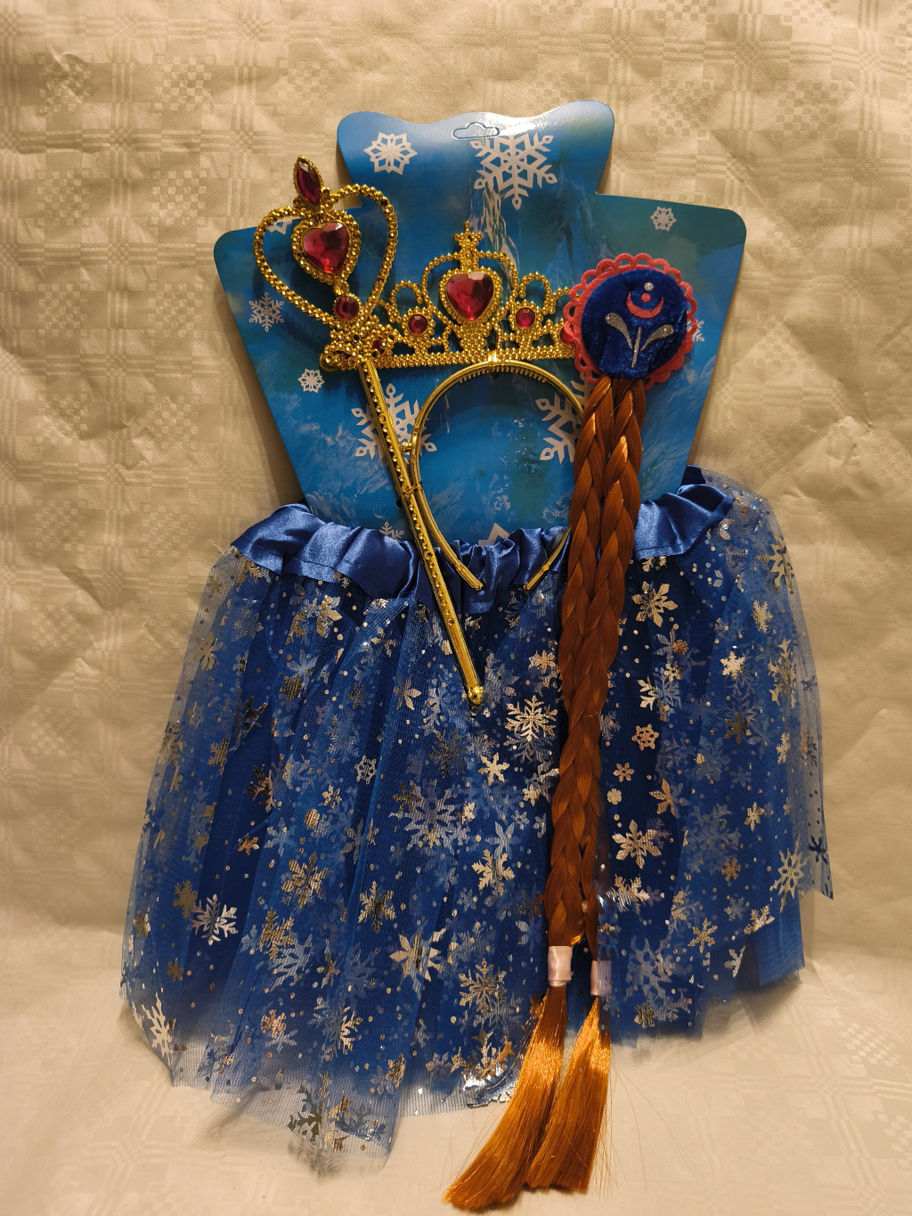Varázsolj mesebeli megjelenést ezzel a jéghercegnő jelmez szettel, amely tartalmaz egy csillogó koronát, varázspálcát, fonott copfot és hópelyhes szoknyát. Tökéletes választás hercegnős jelmezhez, farsangra, születésnapi bulira vagy szerepjátékhoz.