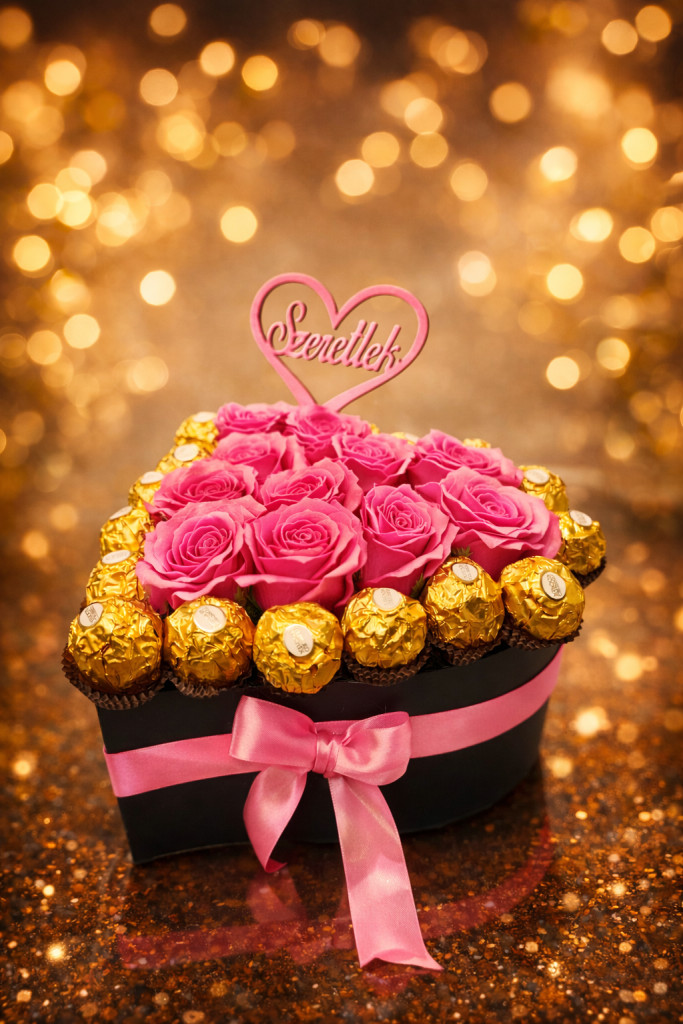 A Love Deluxe Szívbox egy különleges, luxus ajándék, amely a romantika és az elegancia tökéletes találkozása. A fekete szív alakú dobozt gyönyörű vörös rózsák töltik meg, melyeket körben eredeti Ferrero Rocher csokoládék vesznek körül, így egy igazán látványos és prémium hatású meglepetést kapsz.