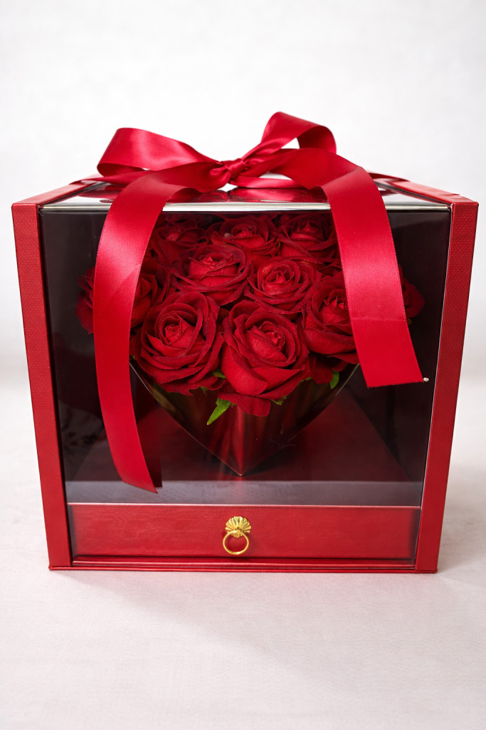 A doboz alsó részében egy diszkréten elrejtett ékszertartó fiók található, amely tökéletes helyet biztosít egy gyűrű, nyaklánc vagy egy különleges meglepetés számára. Így a rózsabox nem csupán látványos dekoráció, hanem egy érzelmekkel teli ajándék is, amely egy fontos pillanatot – eljegyzést, évfordulót vagy vallomást – tesz igazán felejthetetlenné.