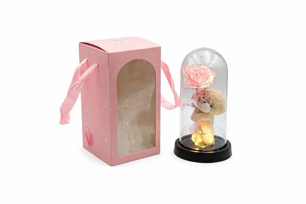 Plüss maci rózsával elegáns üvegbúra alatt, díszdobozban. Tökéletes romantikus ajándék Valentin-napra, évfordulóra vagy születésnapra.