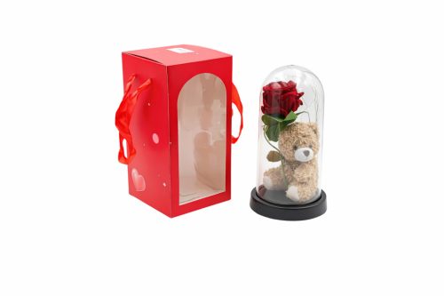 Plüss maci rózsával elegáns üvegbúra alatt, díszdobozban. Tökéletes romantikus ajándék Valentin-napra, évfordulóra vagy születésnapra.