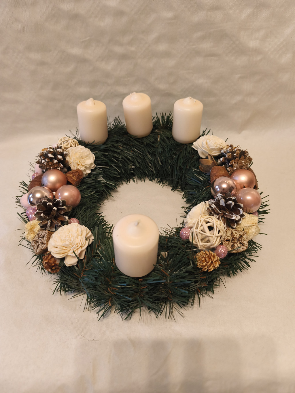 Letisztult, elegáns krém színű adventi koszorú négy gyertyával. Finom, természetes díszítésekkel, melyek harmonikus, nyugodt hangulatot teremtenek az ünnepi időszakban.
