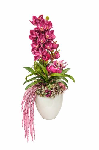 Elegáns mű orchidea virágkompozíció, amely prémium minőségű, élethű virágokból készült. Tartós, gondozásmentes dekoráció, tökéletes otthonba, irodába vagy ajándéknak. Modern és letisztult stílus, amely hosszú ideig megőrzi szépségét.