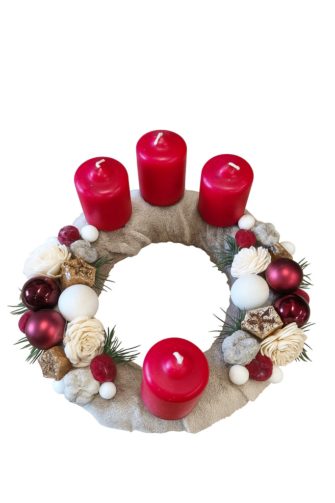 Klasszikus adventi koszorú négy bordó gyertyával, természetes árnyalatú alapra díszítve krém virágokkal, fenyőágakkal és arany–bordó gömbökkel. Meleg, hagyományos hangulatot teremt az ünnepi időszakban.
