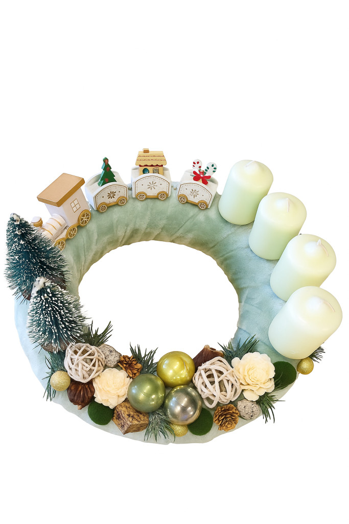 Elegáns, fehér-zöld színekben pompázó adventi koszorú plüss alapon, apró vonatos és fenyőerdős díszítéssel. Különleges, puha és ünnepi dekoráció, amely varázslatos fényt visz otthonodba.