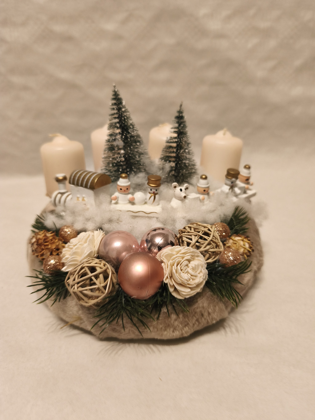 Elegáns, krém színekben pompázó adventi koszorú plüss alapon, apró vonatos és fenyőerdős díszítéssel. Különleges, puha és ünnepi dekoráció, amely varázslatos fényt visz otthonodba.