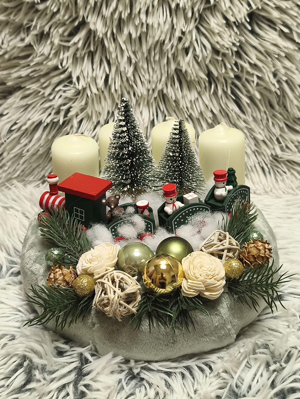 Elegáns, zöld színekben pompázó adventi koszorú plüss alapon, apró vonatos és fenyőerdős díszítéssel. Különleges, puha és ünnepi dekoráció, amely varázslatos fényt visz otthonodba.