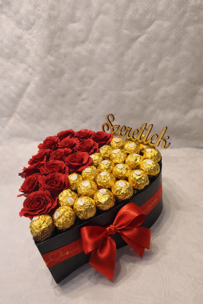 A Royal Love – Örök Rózsa Box a romantika királyi megtestesítője. A luxus fekete, szív alakú dobozban bársonyos tapintású, időtálló örök rózsák kapnak helyet, melyek hónapokon, akár éveken át megőrzik szépségüket. Az arany Ferrero Rocher csokoládék és a mélypiros szalag lenyűgöző kontrasztot alkotnak, igazi luxusérzetet teremtve.