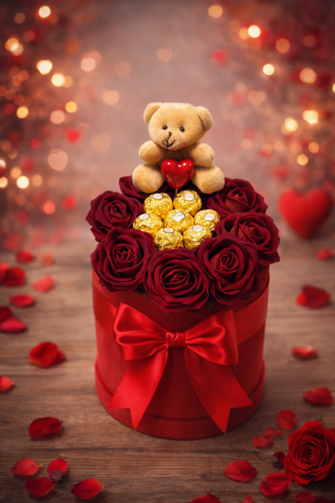 A rózsák közé rendezett aranyfóliás Ferrero Rocher csokoládék az édesség és a luxus élményét nyújtják, míg a doboz tetején elhelyezett bájos plüss maci piros szívvel a meghittség és a szeretet jelképe. A harmonikus színvilág és az aprólékosan megkomponált elrendezés igazán exkluzív összhatást kelt.