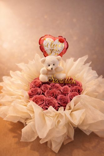 A box középpontjában elhelyezett illatos örök rózsák harmonikus kompozíciót alkotnak a bájos plüss macival és a romantikus „Szeretlek / I love you” kiegészítőkkel. Az elegáns tüll díszítés és a kifinomult színvilág prémium megjelenést biztosít, így ez az örök rózsás ajándék box tökéletes választás Valentin-napra, évfordulóra, születésnapra, eljegyzésre vagy bármilyen alkalomra, amikor időtálló meglepetést szeretnél adni.