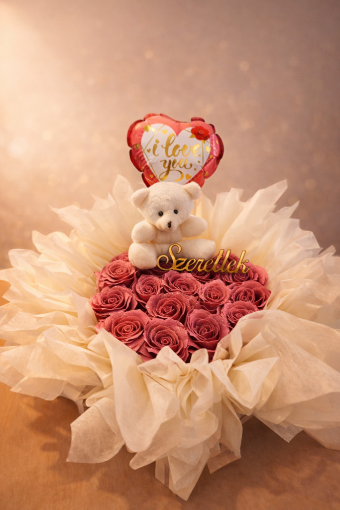 Szívből szeretlek Macis box 20 szál élő rózsával készült, elegáns fehér tüll díszítéssel és bájos plüss macival. Romantikus ajándék szerelmeseknek, Valentin-napra, évfordulóra vagy különleges meglepetésnek.