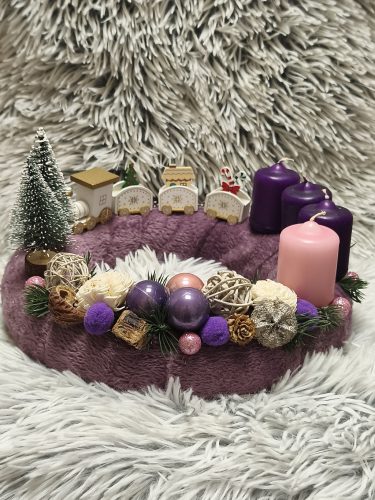 Elegáns, lila színekben pompázó adventi koszorú plüss alapon, apró vonatos és fenyőerdős díszítéssel. Különleges, puha és ünnepi dekoráció, amely varázslatos fényt visz otthonodba.