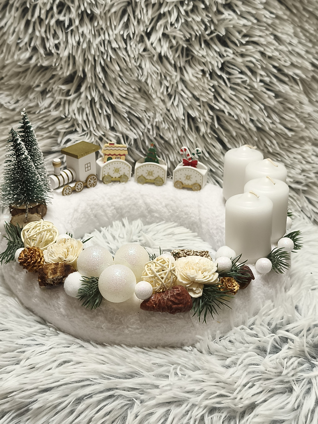 Elegáns, fehér színekben pompázó adventi koszorú plüss alapon, apró vonatos és fenyőerdős díszítéssel. Különleges, puha és ünnepi dekoráció, amely varázslatos fényt visz otthonodba.