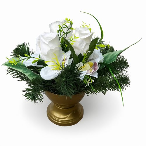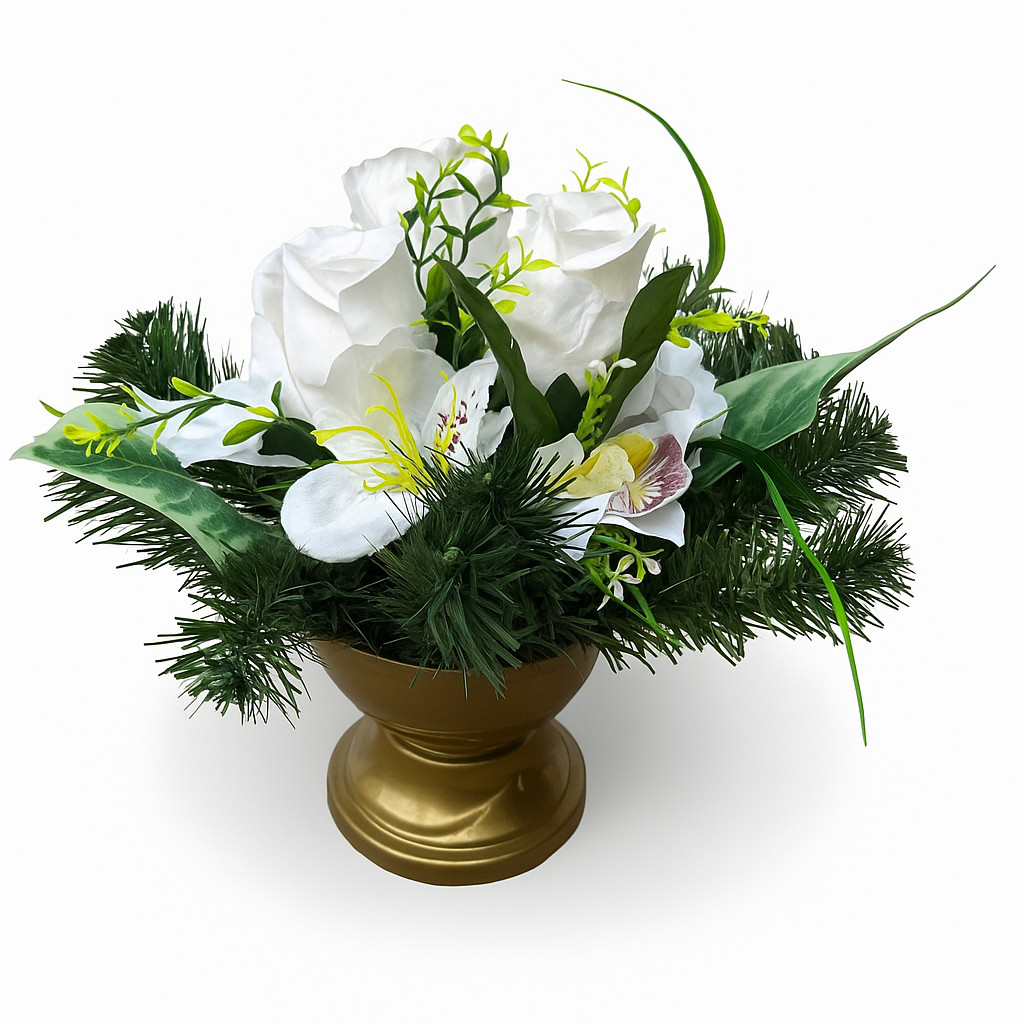 Ez a gyönyörű, kézzel készített mesterséges virágdísz eleganciát és harmóniát sugároz. A kompozíció középpontjában különleges virágok állnak, melyeket élénkzöld fenyőágak ölelnek körül. Az aranyszínű, klasszikus formájú talpas váza kifinomult megjelenést kölcsönöz az elrendezésnek, miközben kiemeli a virágok tisztaságát és a zöld levelek frissességét.
